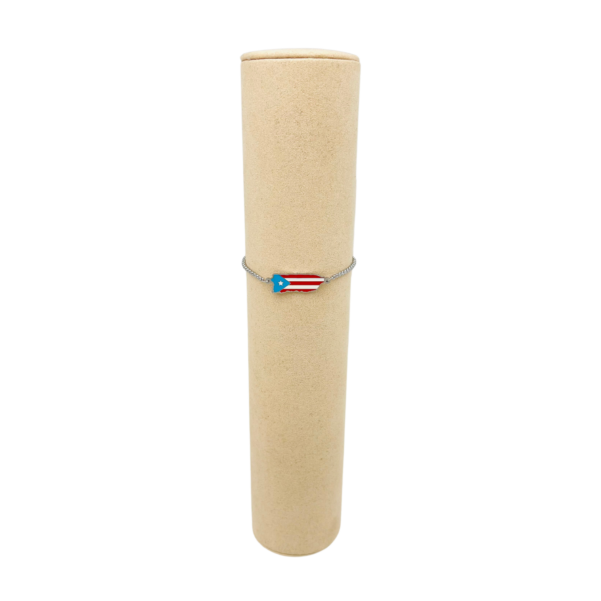 Silver Stainless Steel Adjustable Bracelet with Multi Enamel PR Flag Map Charm from the Puerto Rico Collection.